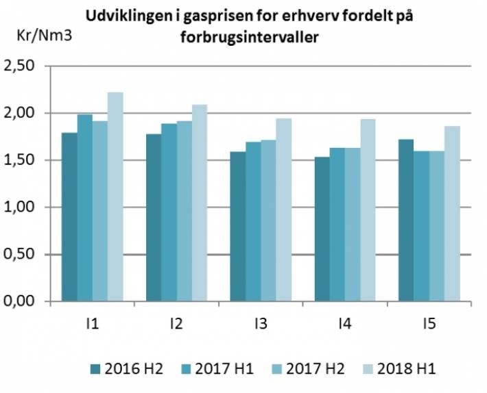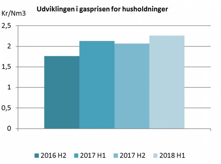 Den gennemsnitlige gaspris for erhverv og husholdninger fulgte udviklingen i gasspotprisen. Gasspotprisen fra andet halvår 2017 til først halvår 2018 steg på 0,38 kr./Nm3, mens husholdningerne og erhvervsforbrugerne til sammenligning gennemsnitligt oplevede en stigning på henholdsvis 0,19 kr./Nm3 og 0,27 kr./Nm3.